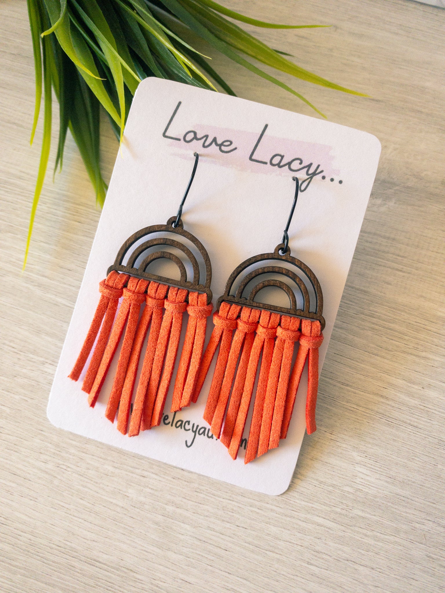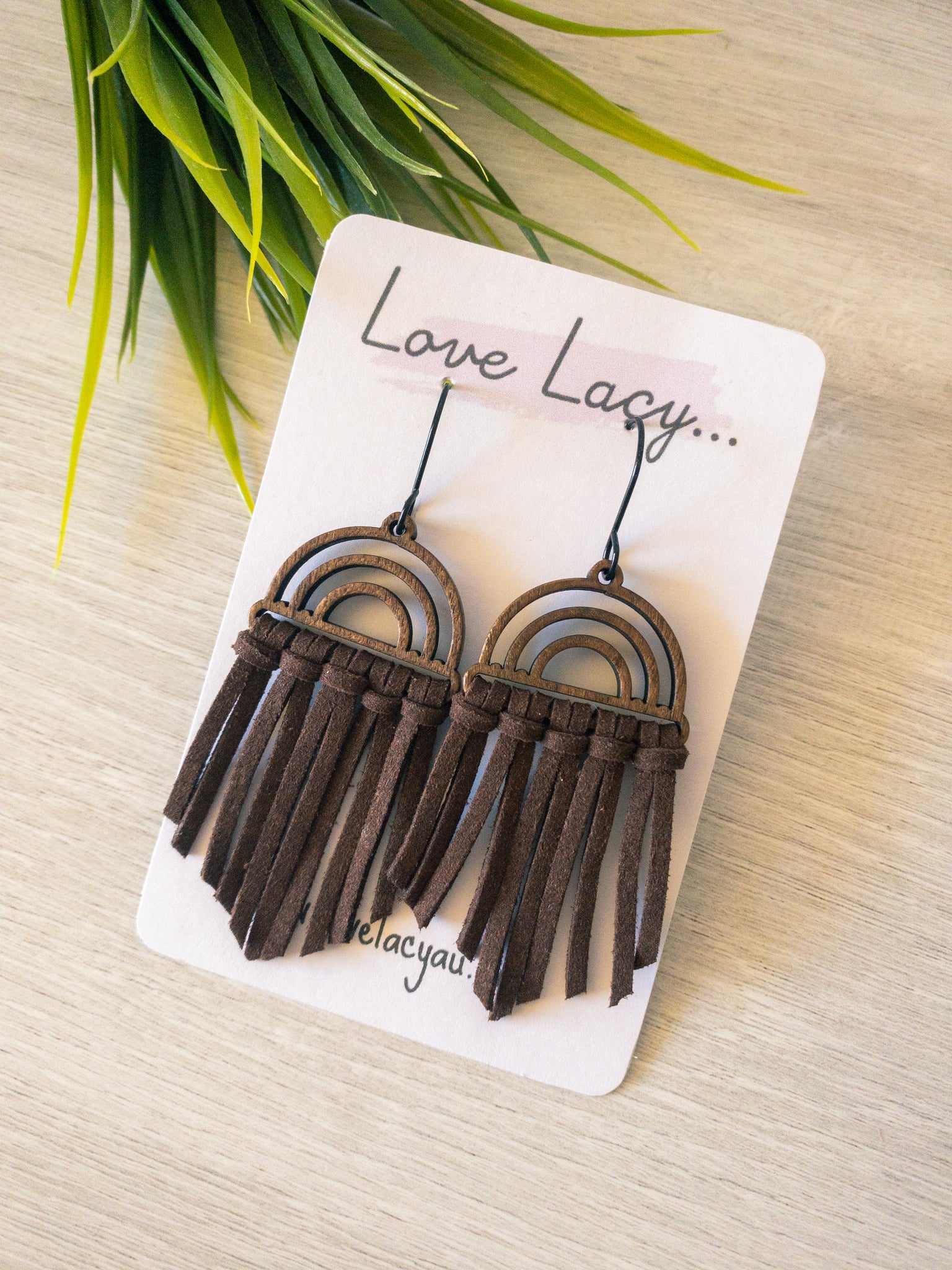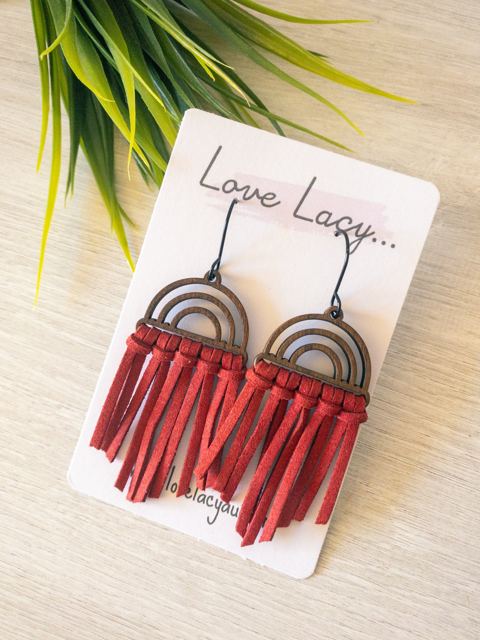The Shireen dangles are made with a wooden arch charm with black hooks and thin suede pieces. They come in 8 different colours and are super lightweight.