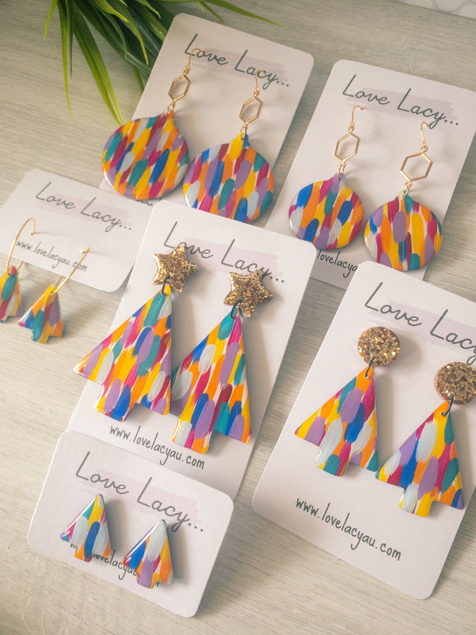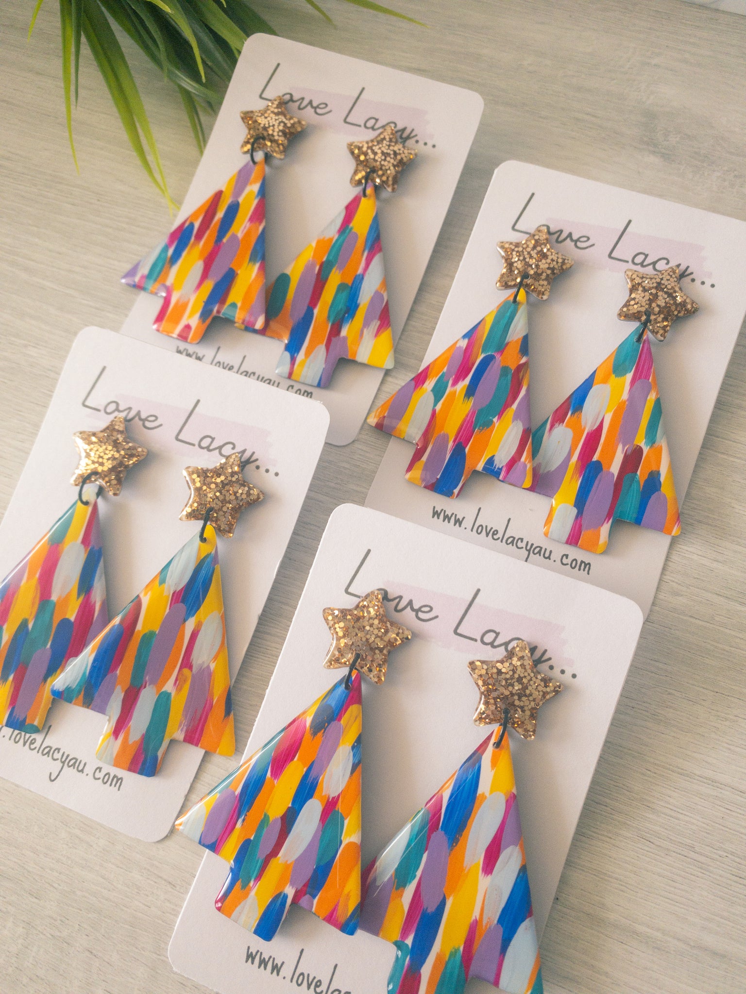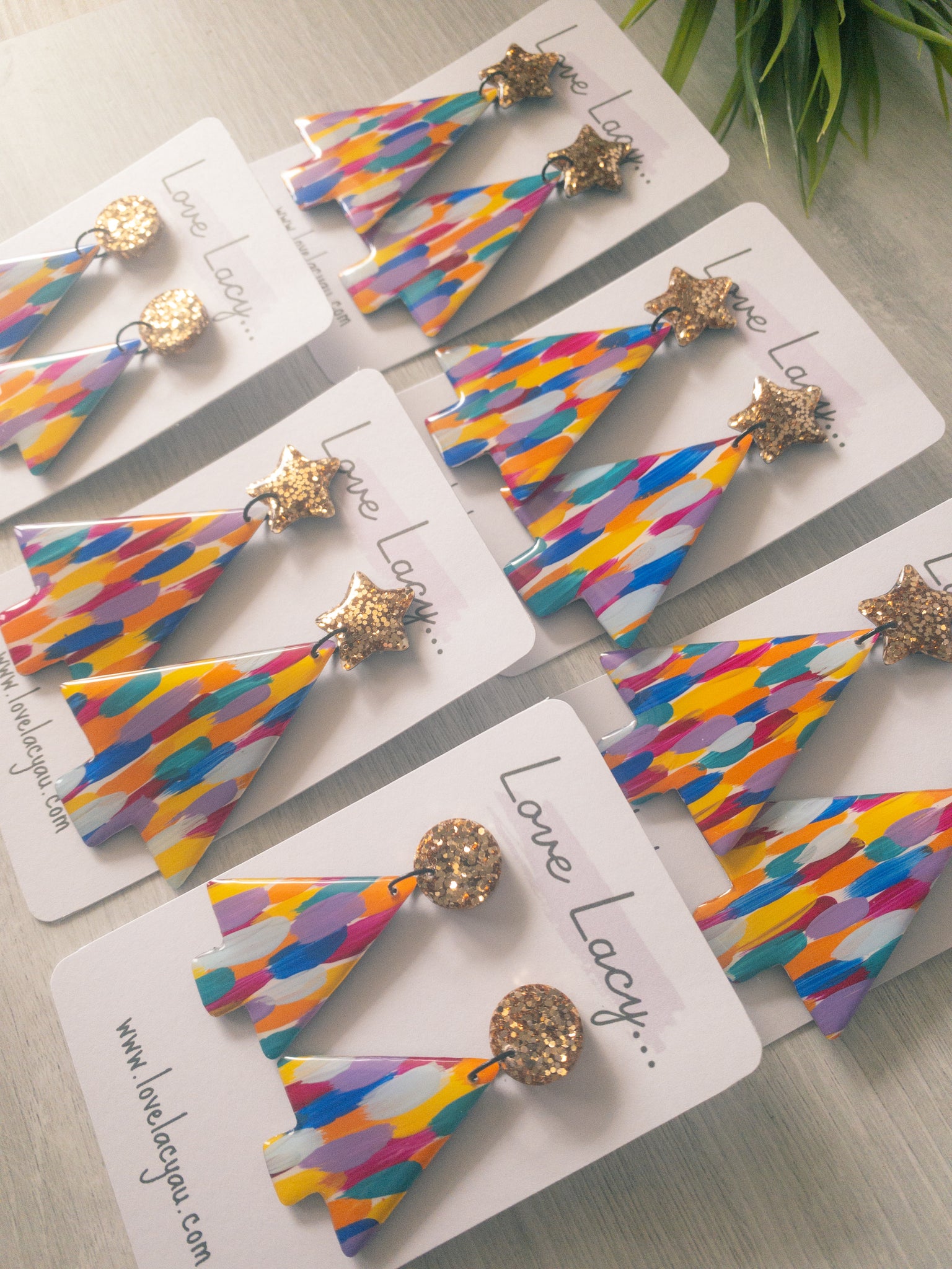 This beautiful hand painted collection is a lovely mixture of purple, pink, orange, blue, green and yellow. The statement Christmas tree has a pretty gold glitter star stud. The pieces are made with clear, shiny resin on the front and black resin backs. They have hypersensitive studs and supportive silicone backs and are lightweight and easy to wear.