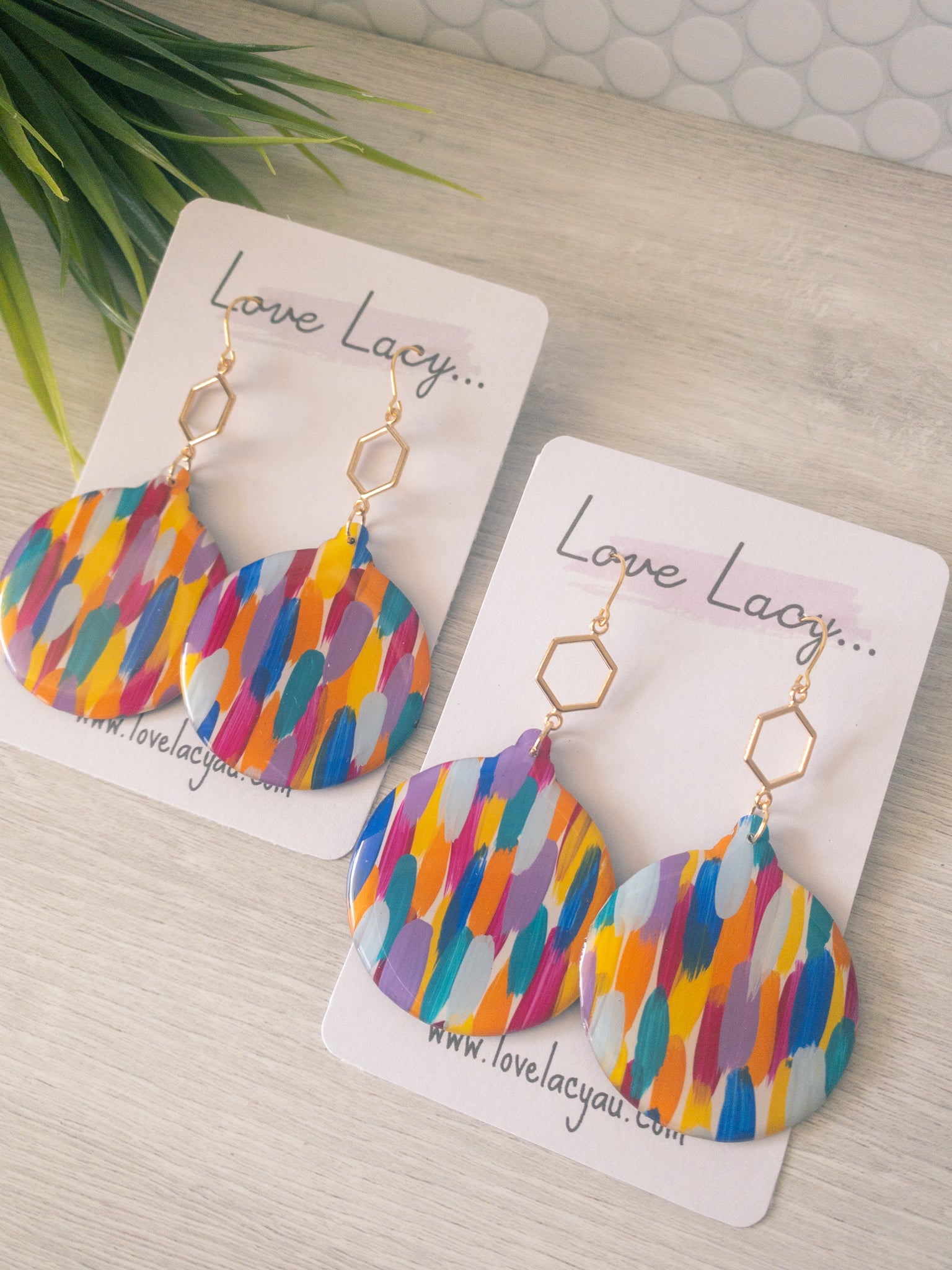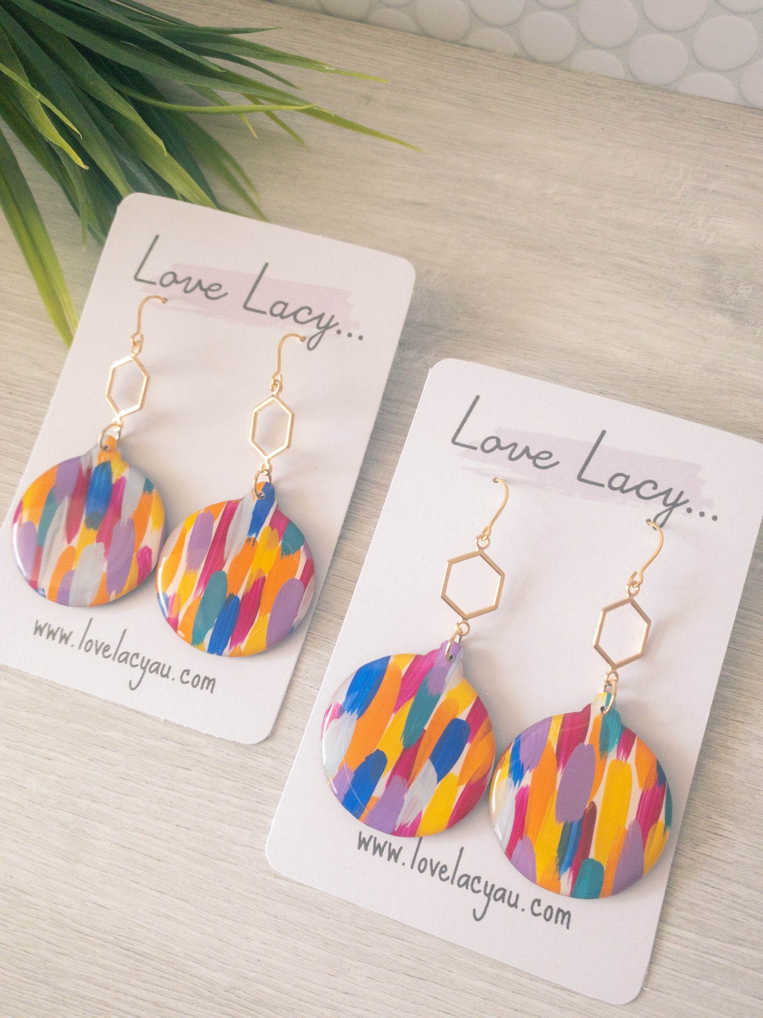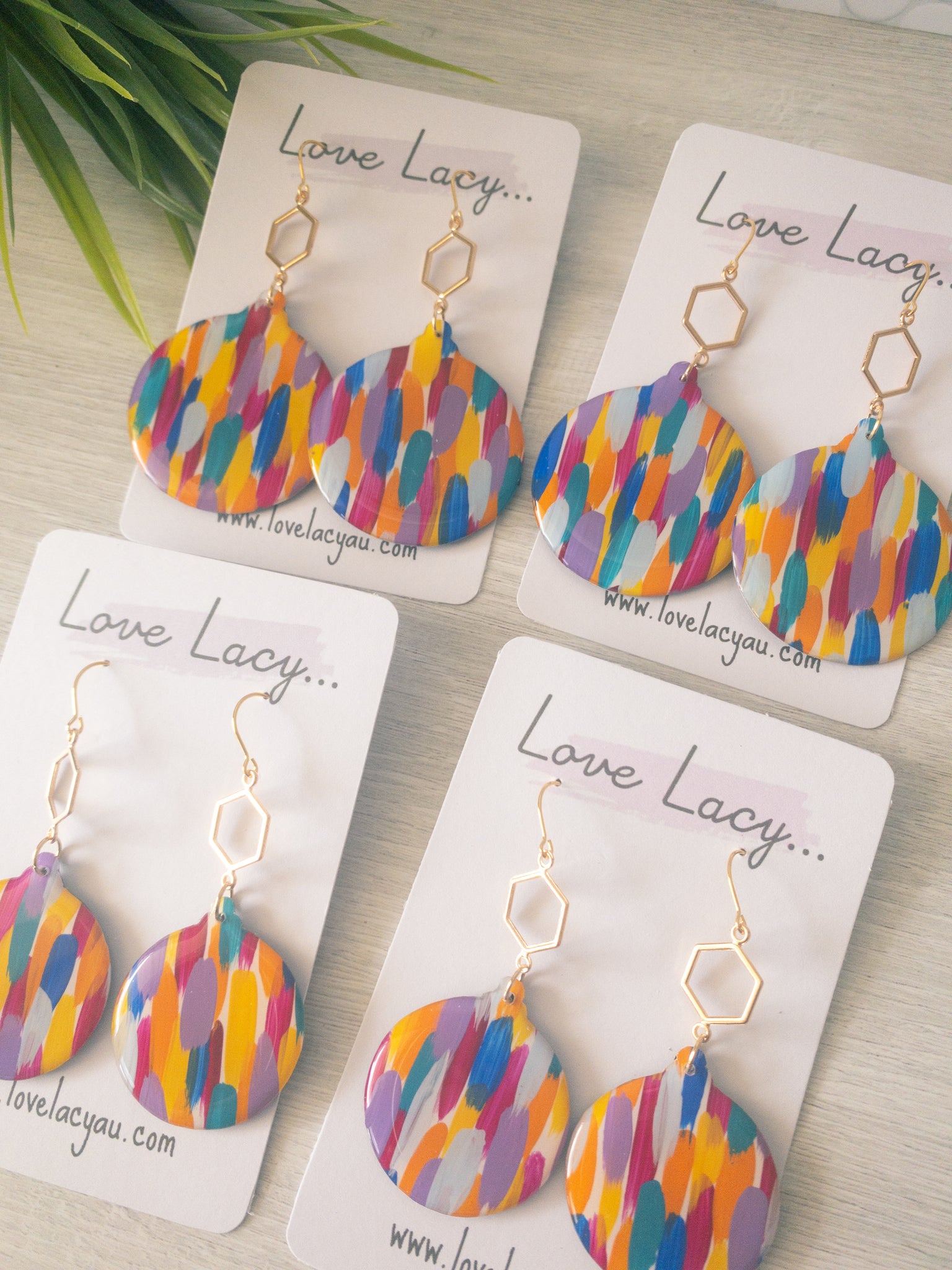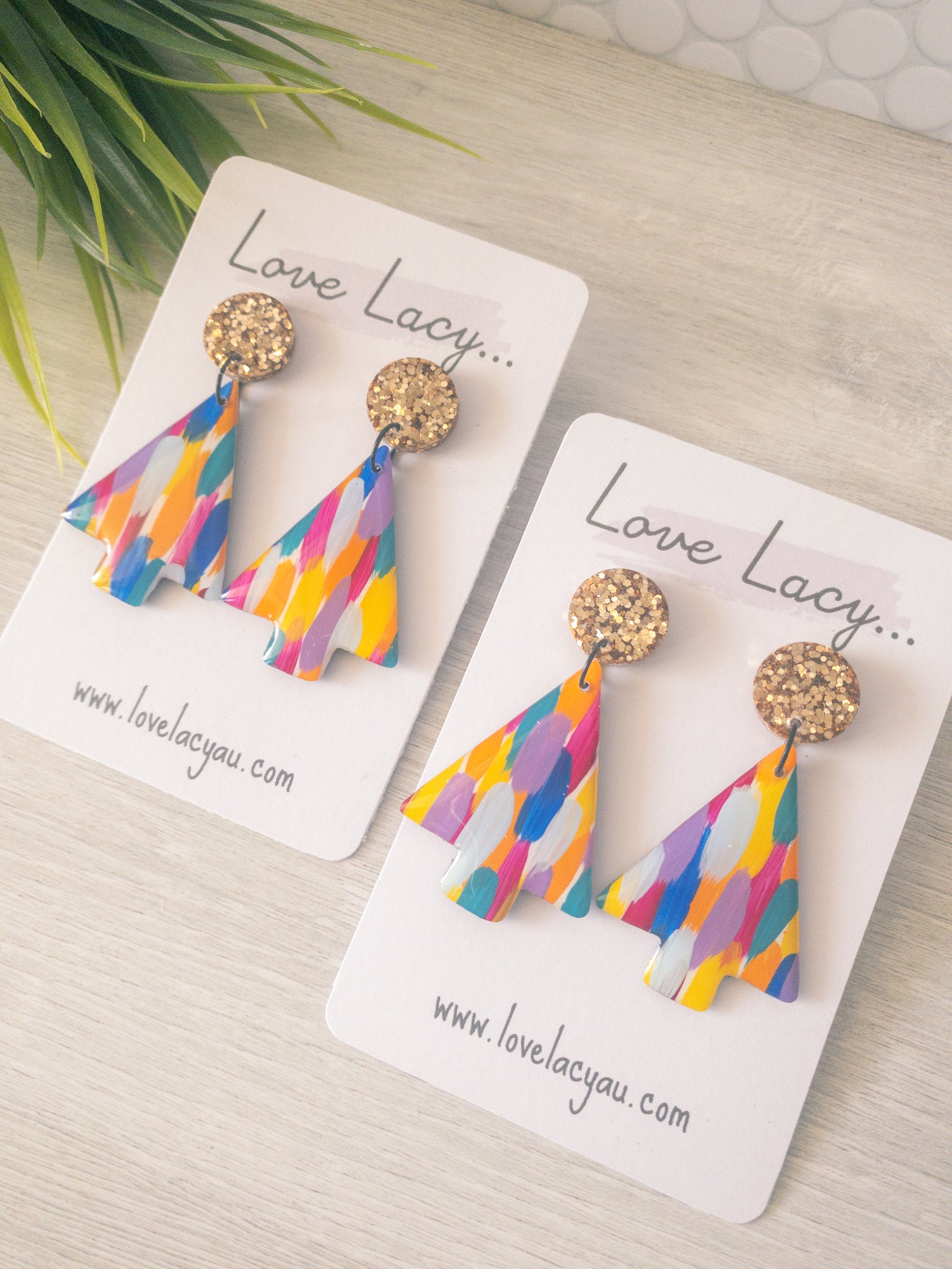 This beautiful hand painted collection is a lovely mixture of purple, pink, orange, blue, green and yellow. The statement Christmas tree has a pretty gold glitter star stud. The pieces are made with clear, shiny resin on the front and black resin backs. They have hypersensitive studs and supportive silicone backs and are lightweight and easy to wear.